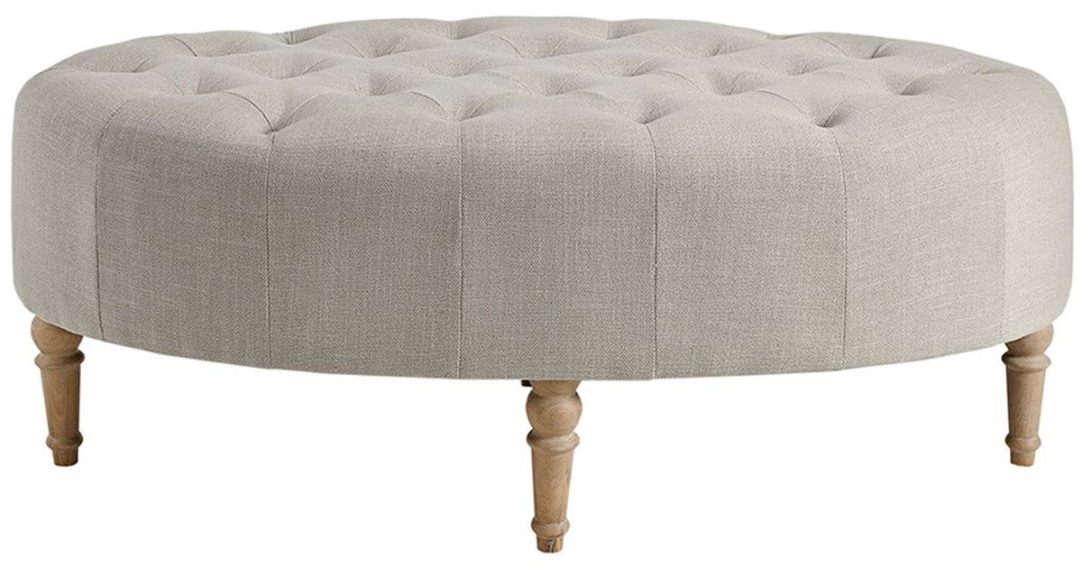 Created exclusively for the Martha Stewart Bedford furniture collection that embodies country farmhouse living, complete your living space with the Clara Accent Ottoman. This oval ottoman is upholstered in a linen-hued fabric and features a button-tufted top that adds an elegant accent to the design. The solid wood legs screw in and showcase a reclaimed natural wood finish to complement the upholstery, creating a farmhouse-inspired look. At her country farmhouse, Martha enjoys bringing the outdoors in. This functional and practical lifestyle is evidenced in her thoughtfully appointed decor which embraces a neutral color palette that acts as a perfect backdrop to four seasons of color. Leg assembly required.