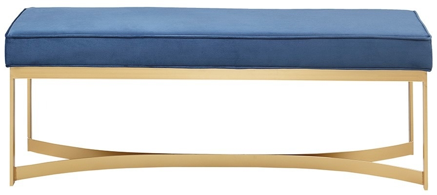 Update your home décor with the sleek style of the Martha Stewart secor bench. This accent bench features a blue upholstered seat with a gold metal base that creates a chic modern look. Place this bench in your entryway, bedroom, or living room to give your home décor a contemporary touch. No assembly required. Read More
