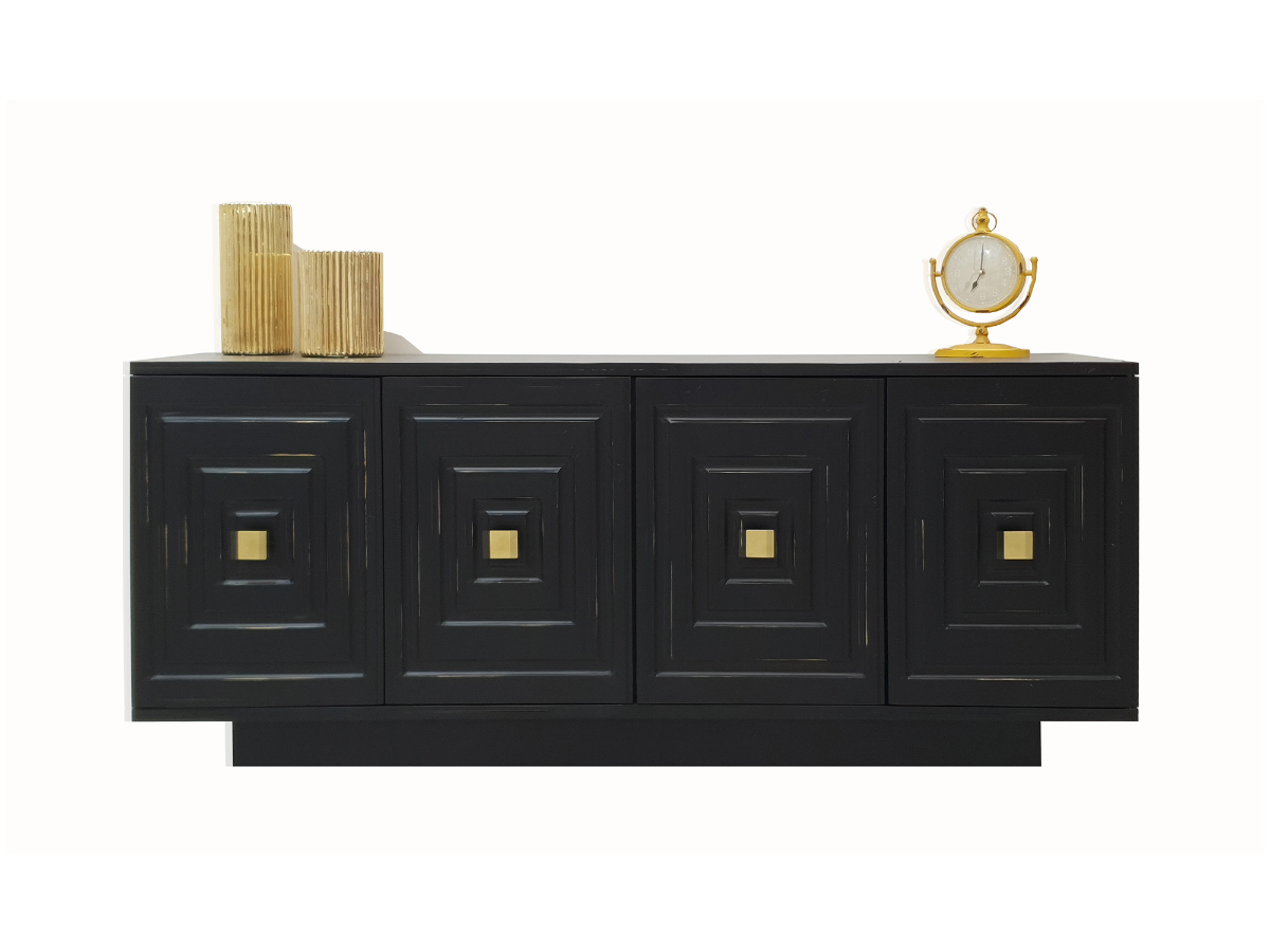 Enhance your entertainment space with the Palmer Entertainment Console, available in white or black to suit your decor. This console features four doors, each adorned with square detailing that adds a touch of sophistication. The gold square hardware complements the design beautifully, adding a luxurious accent to the piece. With ample storage space, the Palmer Entertainment Console is perfect for organizing your media accessories, while its sleek and stylish design elevates the look of your room. Whether you choose the white or black finish, this console is sure to be a stunning addition to your home.