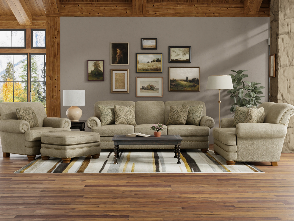 The Paloma Sofa, Chair, and Ottoman Set is the perfect blend of traditional elegance and modern comfort. Upholstered in a soft cream-colored fabric, each piece in this set features classic design elements like nailhead trim, rolled arms, and turned bun legs. The set is meticulously crafted in the USA, ensuring top-notch quality and durability. The sofa offers ample seating with plush cushions, while the chair provides a cozy spot for relaxation. The ottoman completes the set, offering additional comfort and versatility. Together, these pieces create a warm and inviting atmosphere, making your living space both stylish and comfortable. Read More