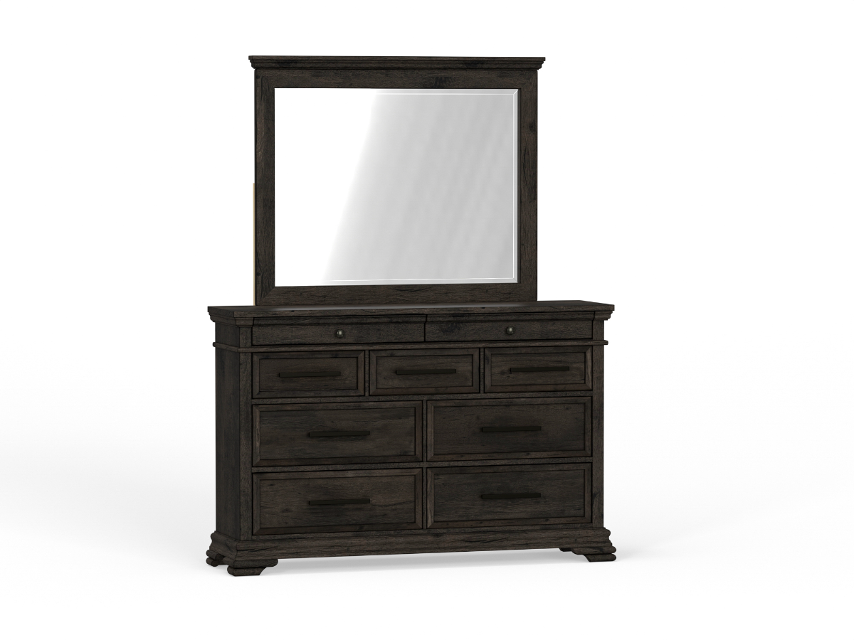 The Park Dresser and Mirror set blends timeless style with everyday functionality, making it a standout addition to any bedroom. Crafted from durable MDF and engineered wood in a dark gray wash, it features a prominent wood grain that adds texture and depth to its classic design. Sleek black hardware provides a modern contrast, while the large attached mirror enhances the sense of space and light in your room. With nine drawers, this dresser offers ample storage to keep your wardrobe and accessories neatly organized. Read More