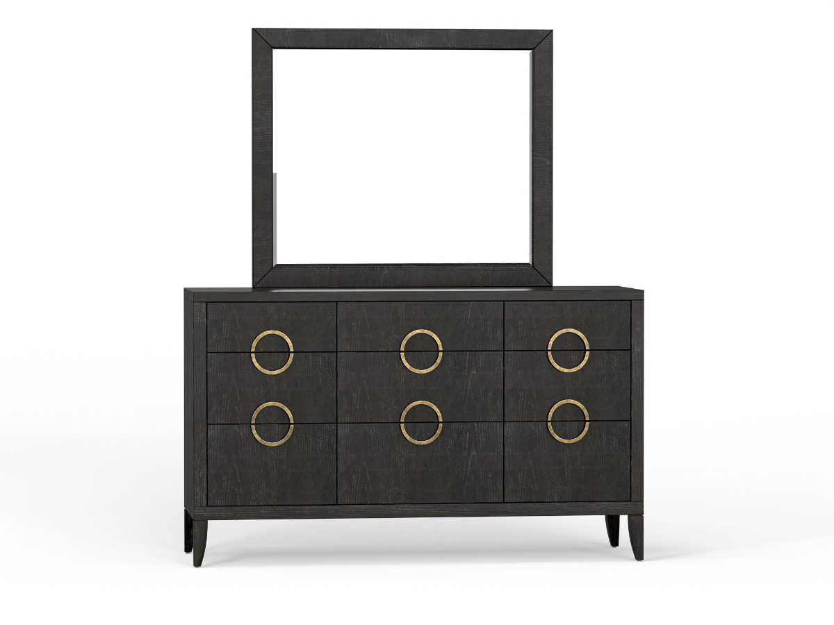 Gold ring hardware adds a touch of sophistication and coordinates beautifully with the dark wood tones, creating a striking contrast that elevates the overall design. Topping it off is a large framed mirror that enhances light and creates a sense of openness in your space. With premium materials, thoughtful features, and an eye-catching aesthetic, the Perkins Dresser and Mirror set is both functional and stunning.