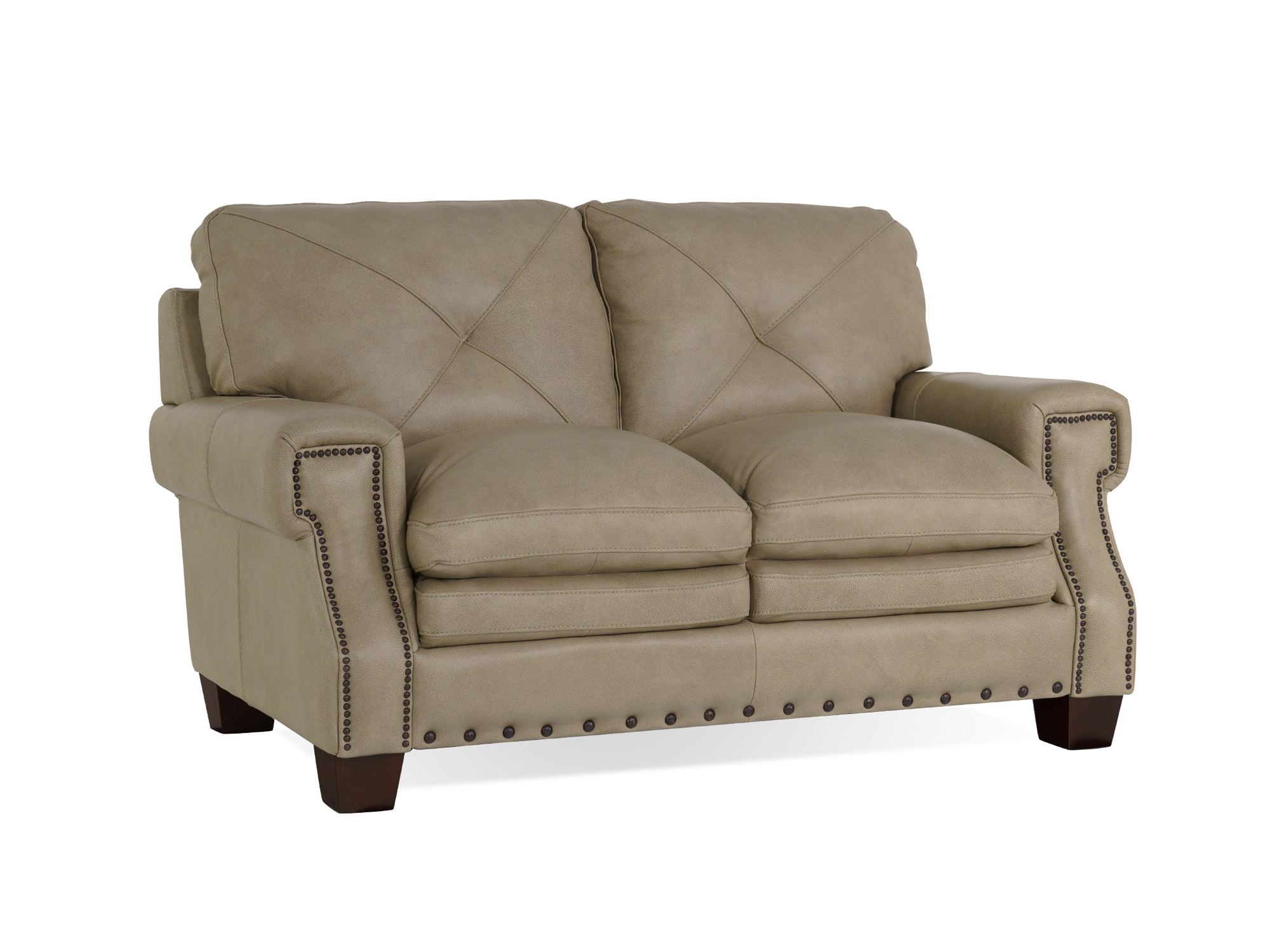 The Pilot Pebble Leather Loveseat is a refined and inviting addition to your living space, offering comfort and style for two. Upholstered in light brown top grain leather, this loveseat exudes a sense of luxury and durability. The nailhead trim along the edges adds a touch of sophistication, enhancing the classic design. Square-designed rolled arms contribute to the timeless silhouette, while the pillow back with x detailing ensures a comfortable and visually appealing seating experience. Perfectly sized for two, the Pilot Pebble Leather Loveseat is an ideal choice for cozy conversations or shared relaxation. Elevate your living room with this loveseat, where the combination of quality craftsmanship and elegant design creates a harmonious and inviting atmosphere. Read More
