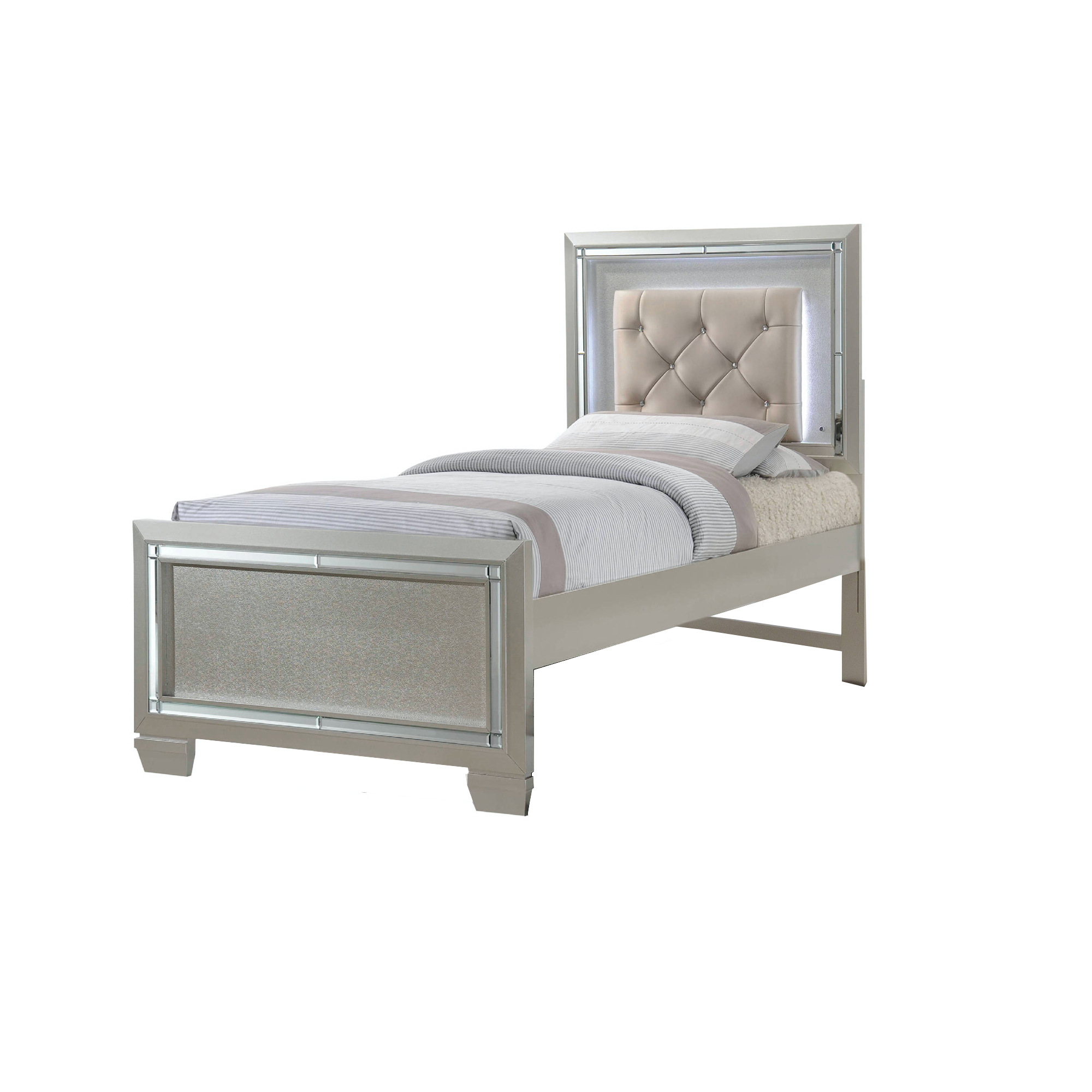 The Platinum Bed is a glamorous and sophisticated choice for a youth bedroom, offering a perfect blend of style and functionality. Available in both twin and full sizes, this bed is crafted from engineered wood, ensuring durability and a sleek design. The champagne finish adds an elegant touch to the overall aesthetic, creating a luxurious atmosphere in the bedroom. The tufted headboard is a focal point, exuding sophistication and comfort. Adding to the bed's allure are built-in lights on the headboard, providing a soft and ambient glow for reading or creating a cozy ambiance. Enhancing the bed's opulence, shiny mirror trim adorns both the tufted headboard and the footboard, creating a reflective surface that contributes to the chic design. The mirror trim around the footboard adds an extra touch of glamour, completing the overall luxurious look of the Platinum Bed.