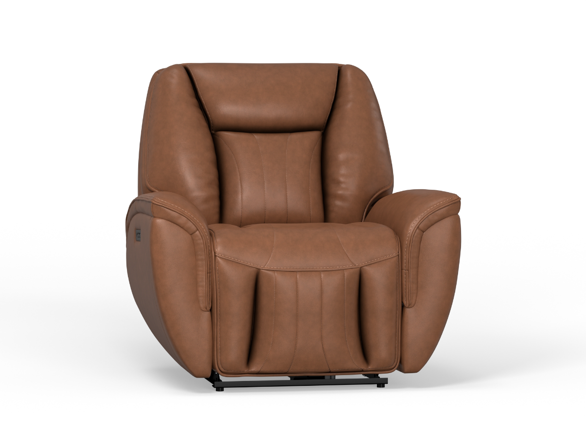 Indulge in luxurious comfort with the Portum Power Leather Swivel Recliner. Upholstered in brown top grain leather, this recliner exudes sophistication and style. Equipped with power buttons on the side, including USB Type A and C ports, the Porto recliner allows you to recline effortlessly and charge your devices conveniently. The swivel functionality enhances the recliner's versatility, allowing you to turn and recline with ease. Relax in style and comfort with the Porto Power Leather Swivel Recliner.