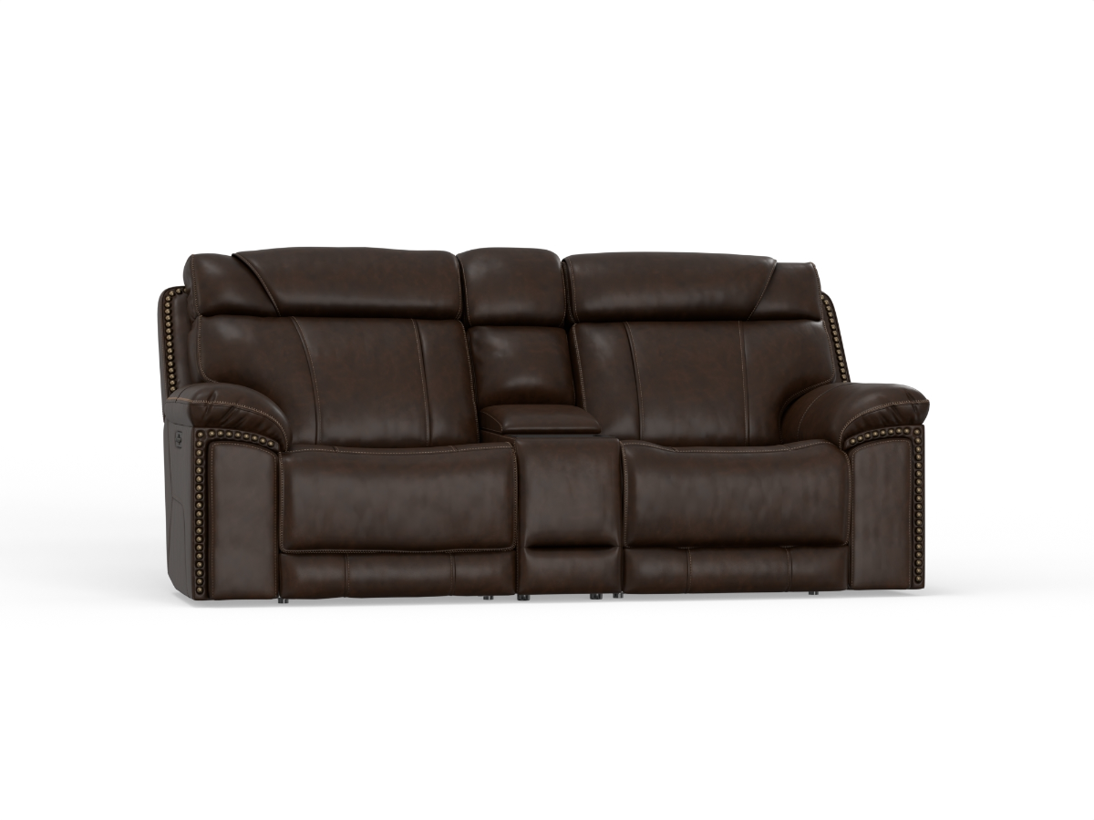 The Ravenna Console Leather Loveseat offers a blend of luxury and practicality for your living space. Upholstered in rich brown leather, this loveseat features triple power with Zero Gravity recline, heat and massage functions, and a wireless remote for ultimate comfort. It is crafted with top-grain leather on the seating areas and durable vinyl on the sides and back, ensuring both elegance and durability. The loveseat is adorned with nailhead trim, adding a sophisticated touch. Additionally, the console includes storage and cup holders, along with USB Type C and Type A ports to keep your devices charged and within reach. This loveseat is the perfect choice for those seeking comfort, style, and modern functionality. Read More