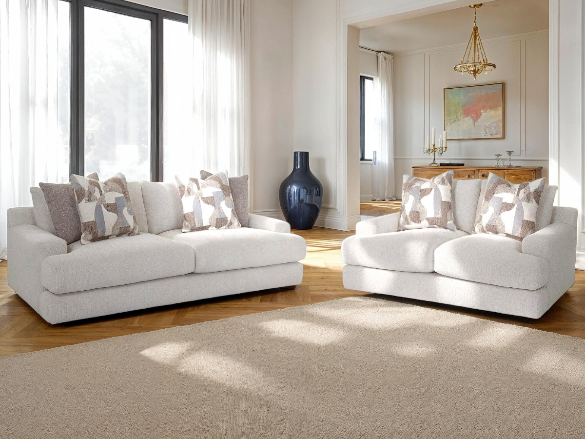 The Serena Sofa and Loveseat Set brings together timeless style, deep comfort, and quality American craftsmanship for a living room that feels both elegant and inviting. Upholstered in a soft light cream fabric, this set offers a neutral, airy aesthetic that works beautifully in a variety of décor styles. Read More