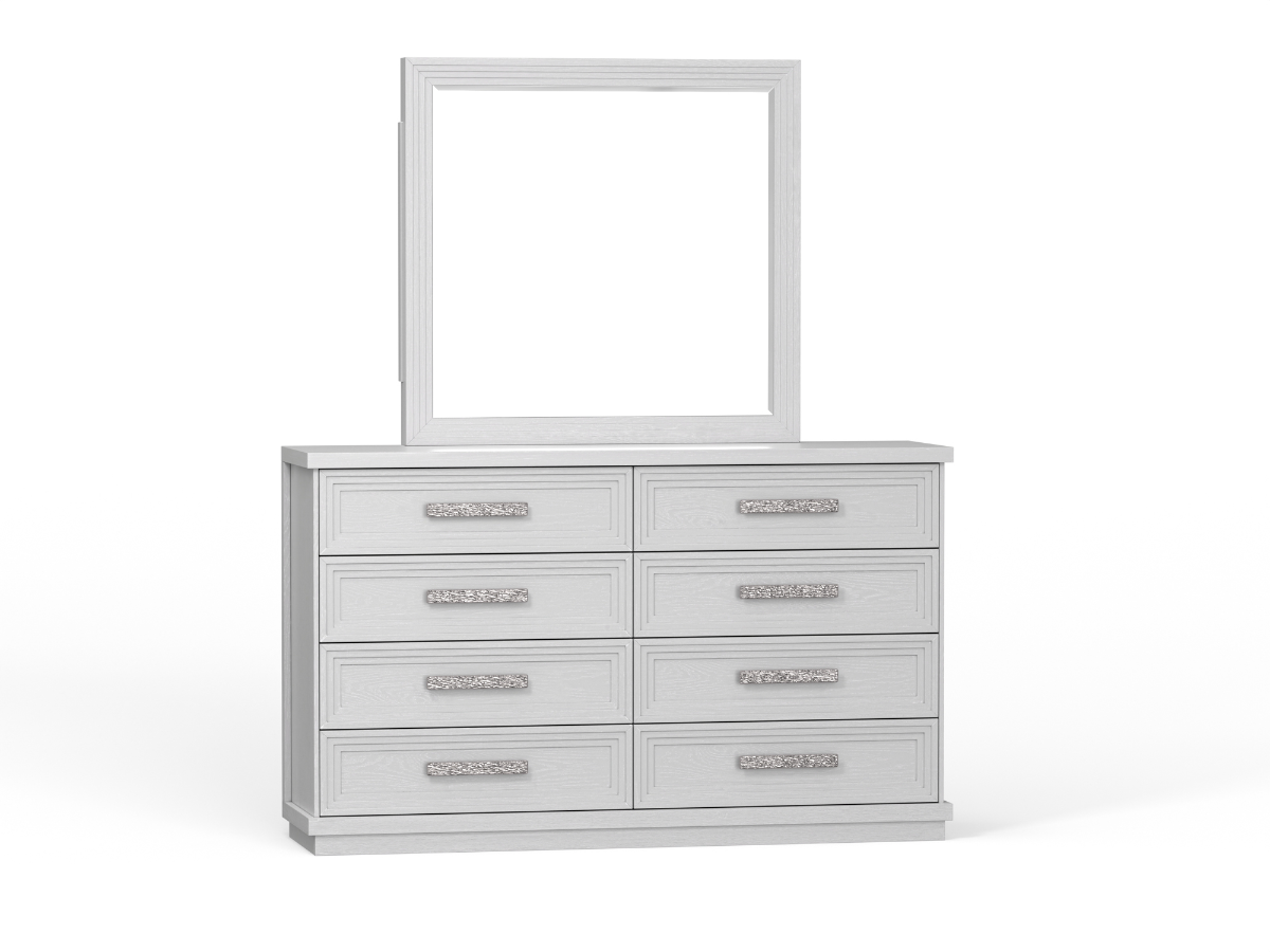 Felt-lined top drawers provide a safe space for delicate items, while cedar-lined bottom drawers help keep clothing fresh and naturally protected. Each drawer is accented with shiny metal hardware featuring a rippled, bark-like texture that adds a subtle organic flair to the dresser’s polished appearance. Topped with a large, coordinating mirror, this set enhances the light and depth of your space while completing the look with a timeless, cohesive feel. Whether paired with the full Snowfall Bedroom Collection or styled on its own, the Snowfall Dresser and Mirror deliver sophisticated storage with a soft, classic aesthetic.
