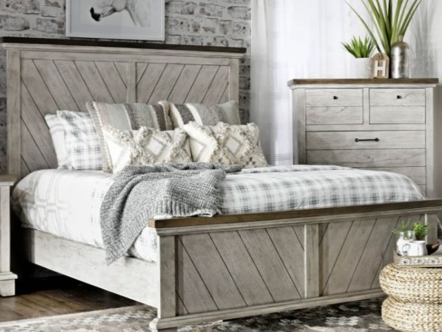 A rustic, farmhouse-inspired bed, Bear Creek features a white-smoke finish that contrasts beautifully with honey-smoke-stained tops and cap rails. The chevron-patterned headboard and footboard is offered in King and Queen sizes and the bedroom collection offers a variety of storage items with ultra-deep drawers supported by side drawer glides for easy operation. Read More