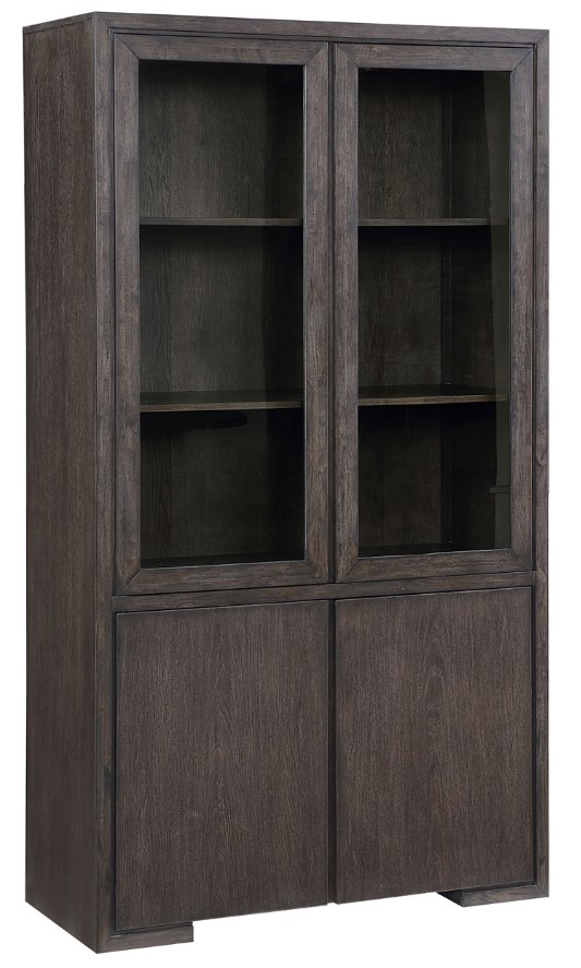 The wire-brushed texture with a waxy hang-up adds depth to the rich color. Glass doors provide an elegant display for china or decorative items, while the wooden bottom doors offer concealed storage for dining essentials. With its sophisticated finish and functional design, the Evan Curio elevates any dining space with style and practicality.