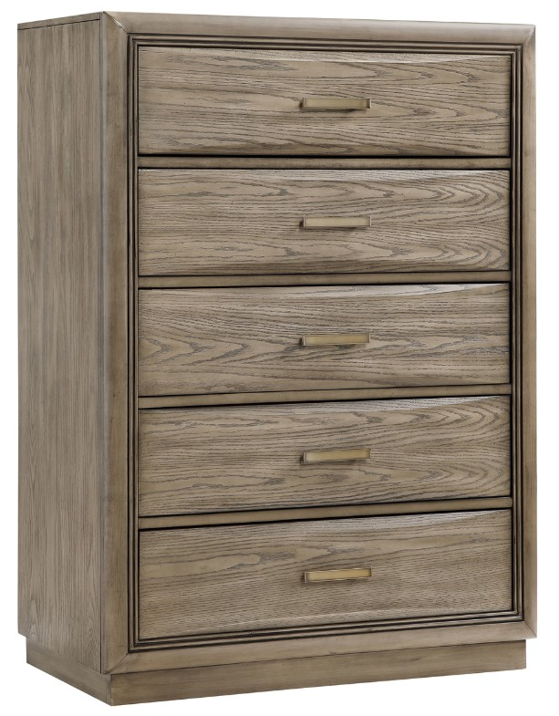 Clean lines and modern transitional style, influenced by campaign design, make this 5-Drawer Chest it a standout piece. Its double-reeded framed drawers, gently shaped drawer and case fronts with mitered corners, and plinth base contribute to its refined elegance