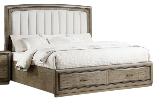 The gently arched headboard is adorned with a cream fabric insert, adding a soft, inviting touch that beautifully complements the cocoa-gray finished oak veneers. The result is a clean, contemporary look that transforms your bedroom into a serene and organized sanctuary. The Sonoma Queen Storage Bed is not just a statement piece—it's a smart, stylish investment for your home.