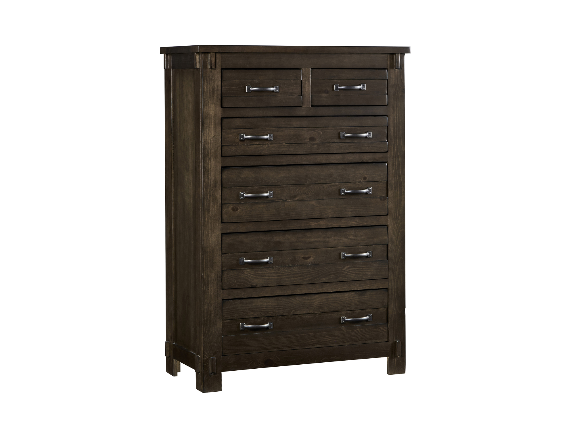 Bed features thick posts and contrasting rods made to look like metal with industrial hex nut hardware, mortise and tenon detail, wide cap rail on footboard to serve as a bench like function. Bed panels showcase offset wood planks for a dimensional look. Cases feature mortise and tenon detail, offset panels on drawer fronts, V groove detail on case tops. Mirror detail emulates headboard design using the industrial metal like look. Drawers are constructed of solid pine using a dado technique and have full extension drawer guides. Hardware consists of a handle with simulated screwhead detail finished in a graphite finish. Molasses finish has slight distressing and is hand applied for a rich finish.