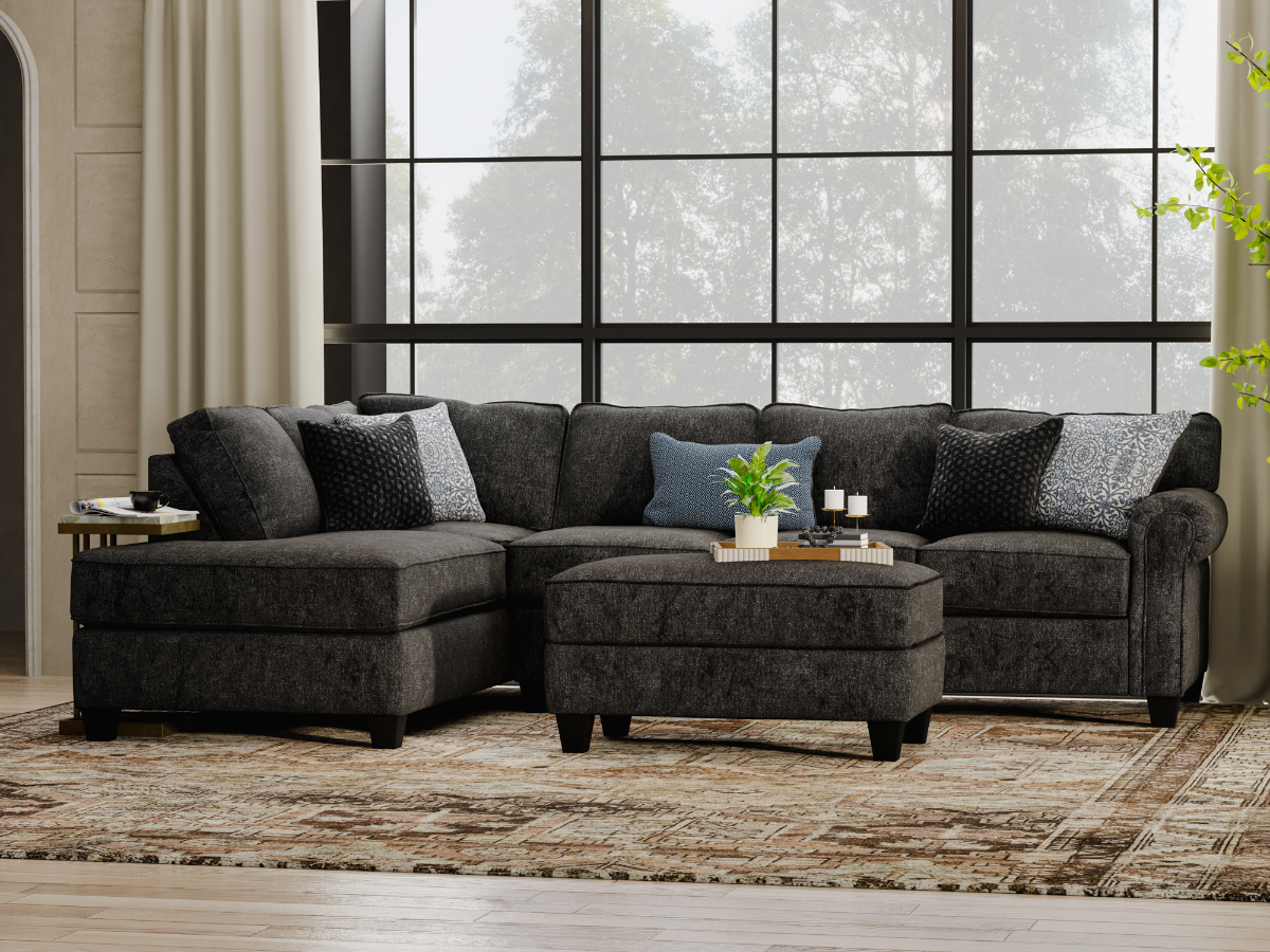 The Thunder 2 Piece Chaise Sectional brings comfort, durability, and exceptional value to your living space. Upholstered in a versatile gray fabric that’s both durable and easy to clean, this American-made sectional is crafted using a blend of domestic and imported materials for long-lasting quality. Read More