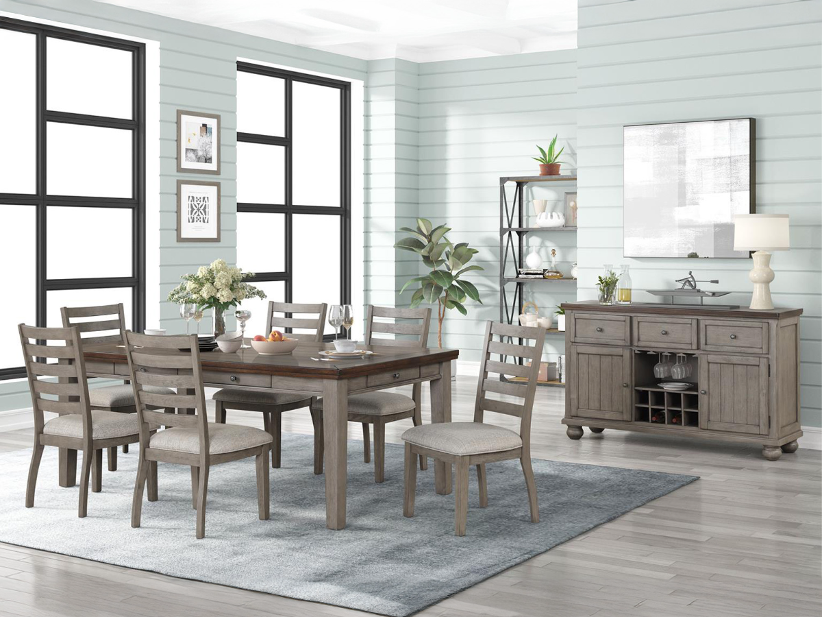 The Travis Dining Set is a perfect blend of rustic charm and modern elegance, ideal for enhancing any dining room. This set includes the Travis Dining Table and four Travis Side Chairs, creating a cohesive and stylish dining space for family meals and entertaining. The Travis Dining Table features a rich brown table-top contrasted with a grey washed bottom and legs, offering a warm and inviting look. Its standout feature is the inclusion of six drawers, conveniently located on all sides of the table, providing ample storage for dining essentials such as utensils, napkins, and placemats. Accompanying the table are four Travis Side Chairs, each crafted from washed gray wood with a classic ladder back design. The upholstered seats ensure comfort during long meals, while the sturdy construction promises durability. Together, the Travis Dining Table and Side Chairs create a harmonious and functional dining set that combines practical storage solutions with elegant design, making it an excellent choice for any home.