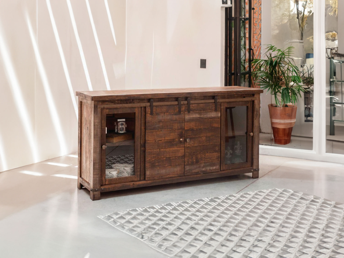 Enhance your entertainment space with the Tulum Entertainment Console. This stylish and functional console measures 71" wide, providing ample room for your TV and media components. The console features a captivating design, combining the rustic charm of sliding barn door-style wood doors in the center with the modern touch of two glass doors on either side. The warm wood finish exudes a cozy and inviting feel, while the metal accents add a touch of industrial elegance. With its well-crafted construction, this console offers durability and longevity. The spacious interior shelves and compartments provide plenty of storage options for your media devices, DVDs, and other essentials, helping you maintain a neat and organized living room. Whether you're enjoying movie nights or hosting gatherings, the Tulum Entertainment Console is sure to become the centerpiece of your entertainment area, seamlessly blending style and functionality to elevate your home decor.
