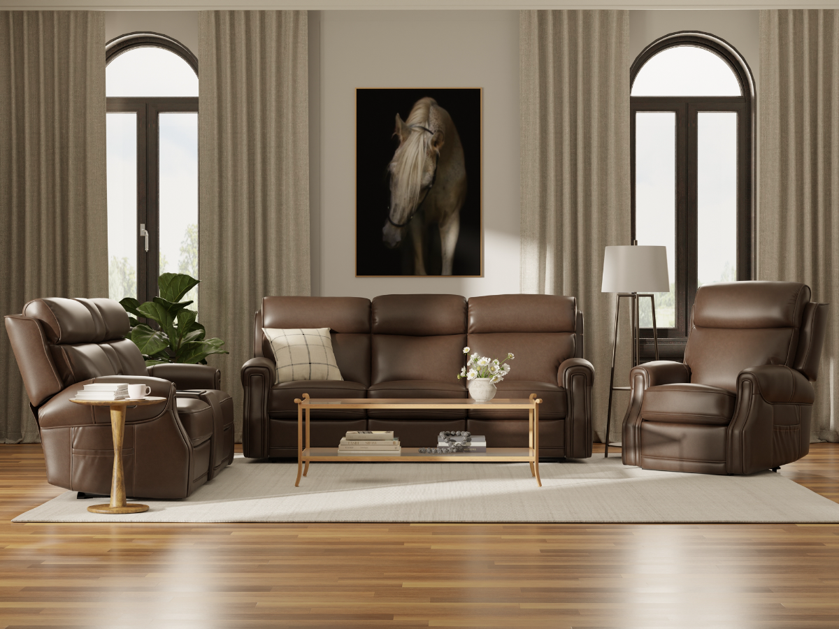 The Umber Sofa, Loveseat, and Recliner Set brings together modern technology, luxurious design, and unmatched comfort. Upholstered in top-grain leather, each piece exudes timeless sophistication and ensures long-lasting durability. The wireless triple power Lay Flat recline feature across all seating provides personalized relaxation, while the heat and massage functionality elevate comfort to the next level. The steel seat boxes deliver superior strength and stability, making this set perfect for everyday use. The loveseat’s console adds practical convenience with hidden cupholders, wireless charging, USB ports, and deep storage, while USB Type A and C ports on each piece keep your devices powered. The Umber Set is an exceptional combination of style, innovation, and quality craftsmanship, making it the centerpiece of any living space. Read More