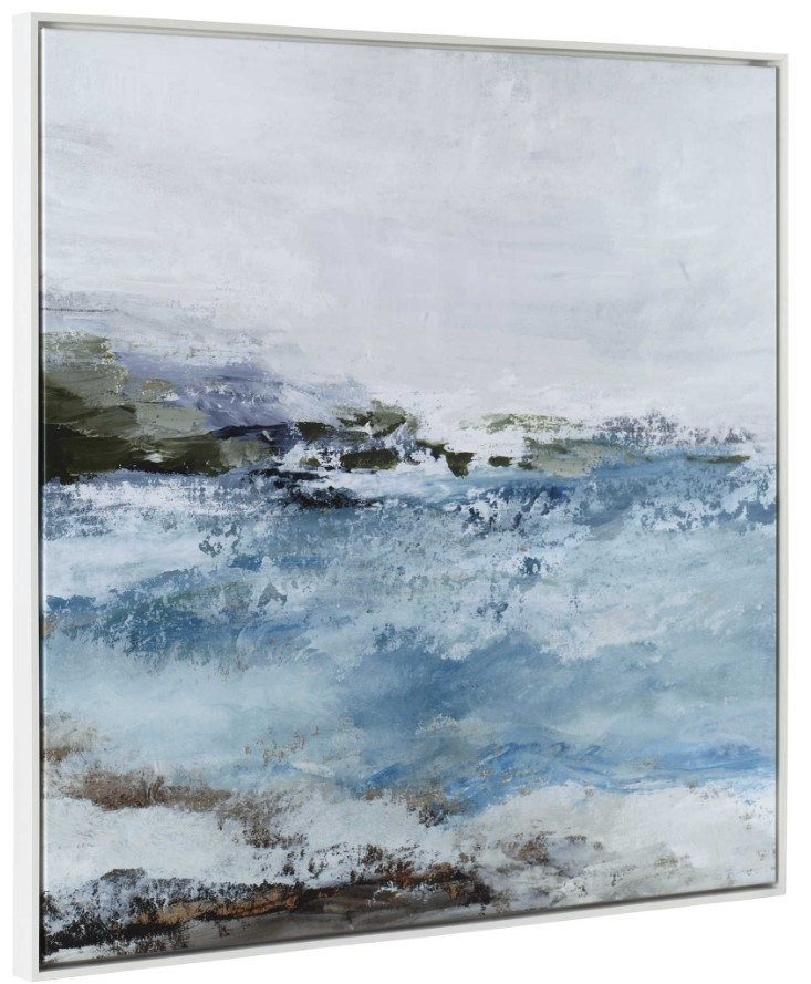 Shades of blue with splashes of raw umber and olive set on a white dove background make up this abstract giclee on canvas. Surrounded by a solid wood gallery frame in white finish. Artwork by Allison Pearce. Read More