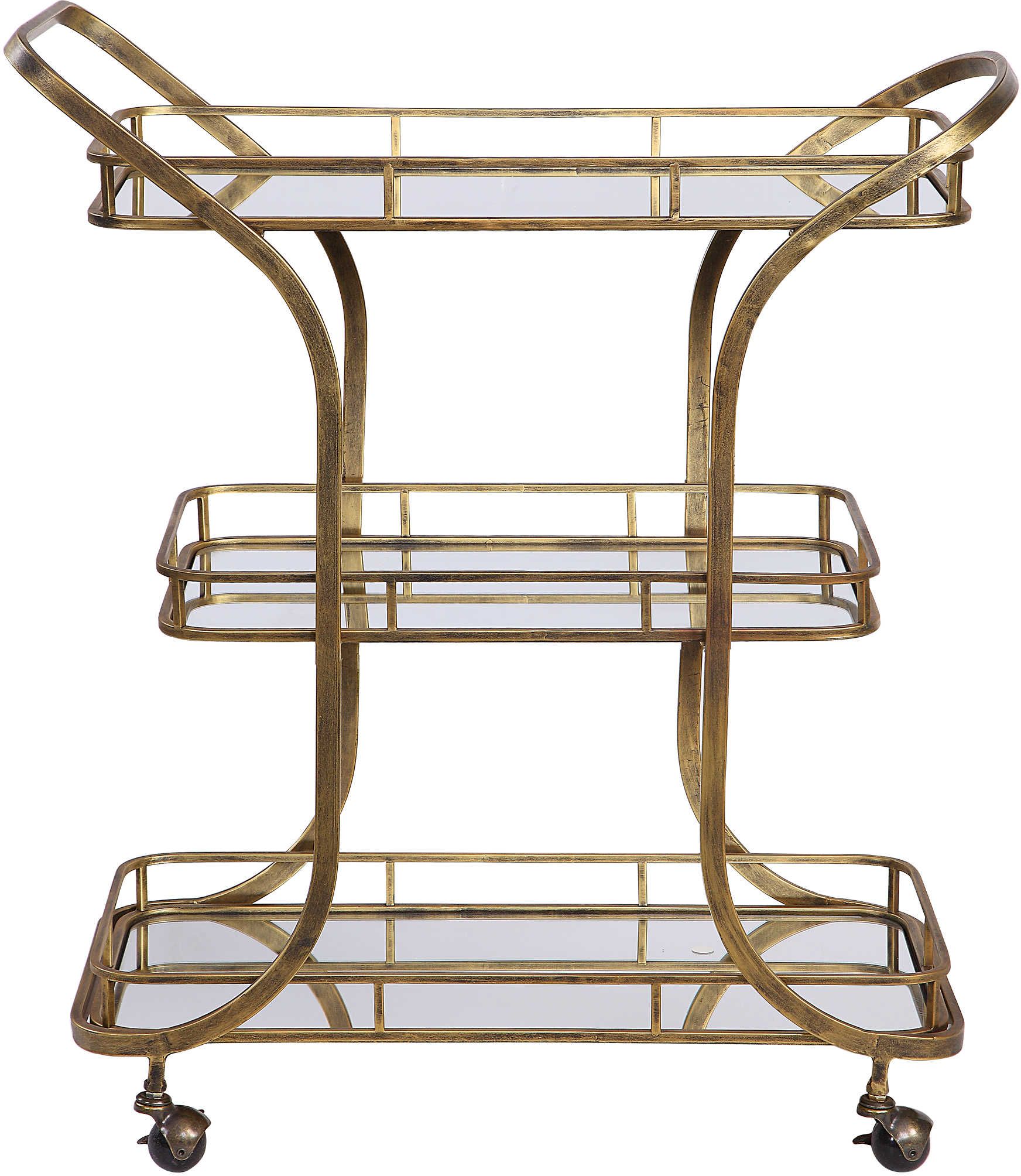 Hand forged in solid iron, this transitional bar cart features three tray style mirrored shelves finished in antiqued gold, complete with rolling casters.