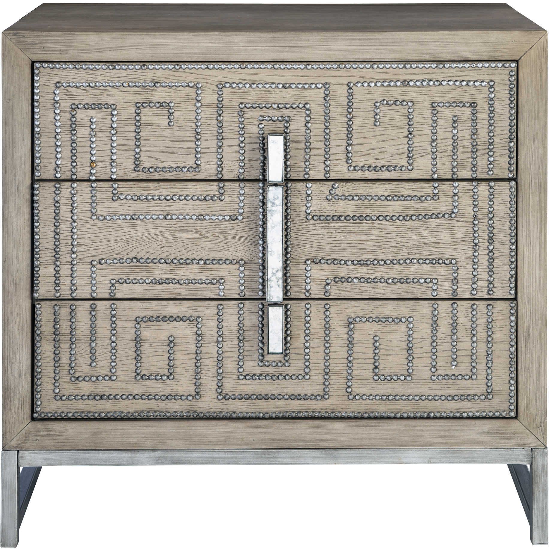Layered in oak veneer in a soft mushroom gray finish, this solid wood three drawer chest showcases a geometric studded design finished in aged pewter paired with mirror accented hardware atop a coordinating solid iron base.