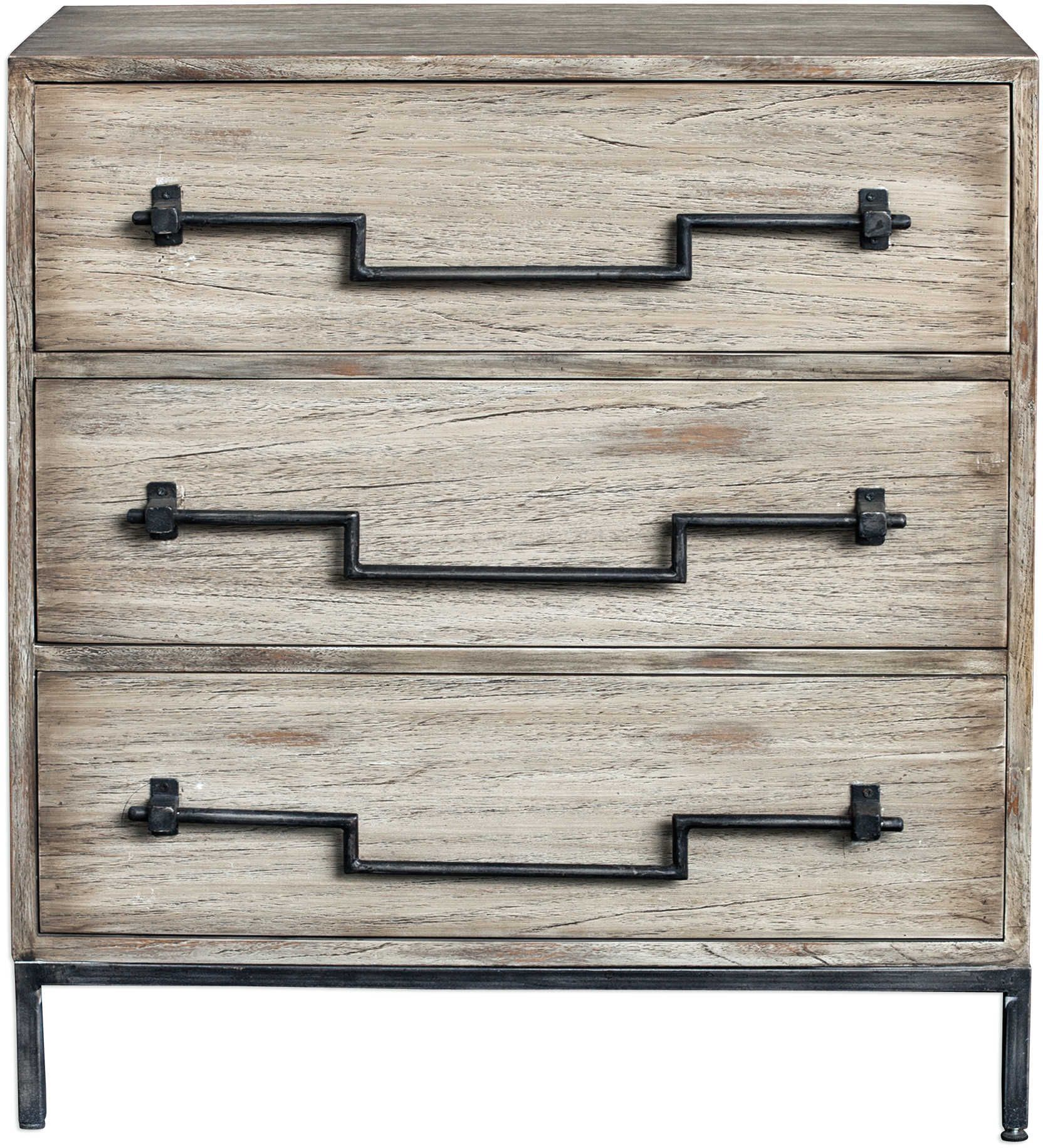Constructed from plantation grown mango wood in an aged ivory finish with ember highlights, featuring old iron drop swing bar pulls, on an industrial iron base. Read More