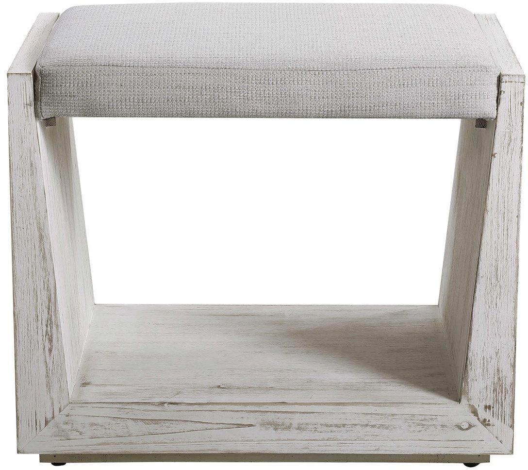 Embodying a fresh and airy feel, this coastal inspired bench features a suspended seat in an off-white waffle weave polyester blend fabric, doubling as a seat or footrest. The solid wood base is finished in a rustic warm whitewashed finish with noticeable rub-through and wood grain details. Read More