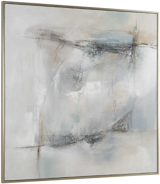 Light and airy shades of gray and sand meet cool blue and green undertones. The hand-painted canvas is accented by fine pencil drawings and is paired with a champagne silver frame. Due to the handcrafted nature of this work, each piece may have subtle differences. Read More