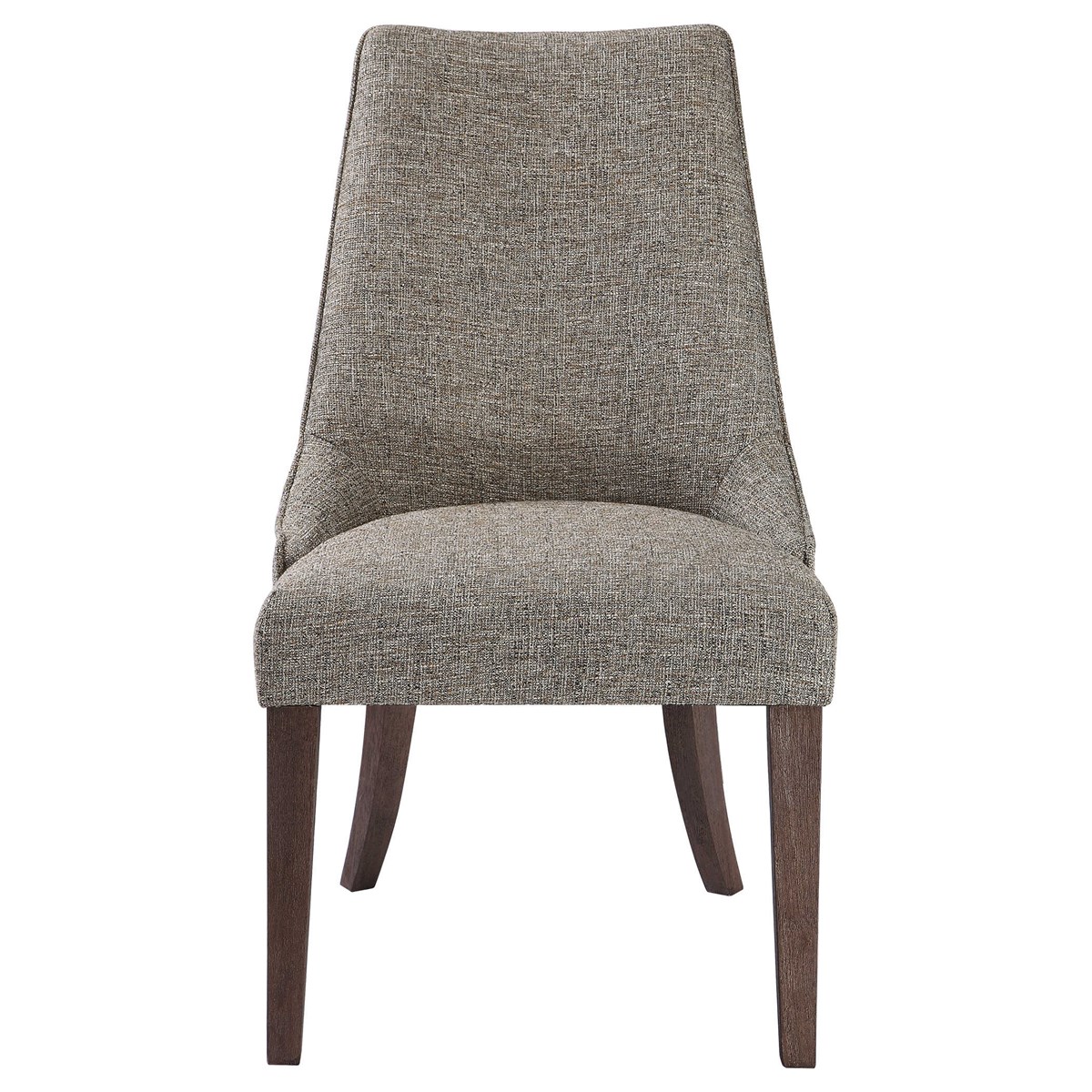 Gracefully shallow side wings and tall, tapered legs make a sophisticated statement in rich earth tones in a slubbed woven polyester with dark walnut finished birch. Seat height is 19".