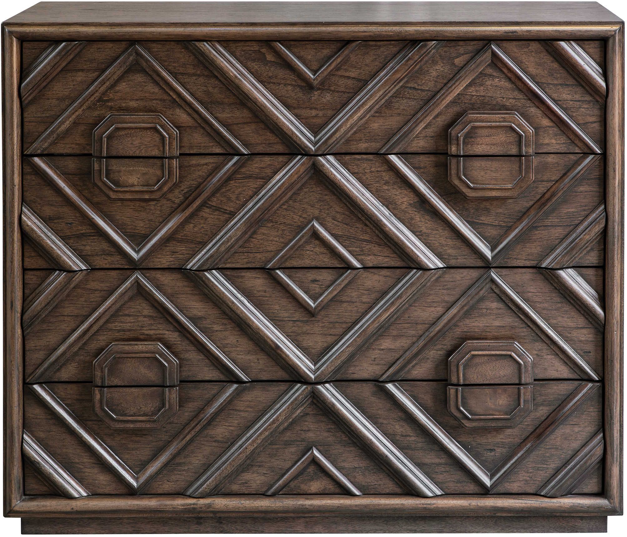 With a transitional deep walnut finish over mindi veneer, naturally distressed and hand rubbed to expose natural undertones, this four drawer chest features an updated geometric carved molding front over a floating plinth base.