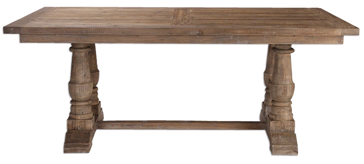 Beautifully pieced, solid wood table is made from 100% reclaimed lumber, sanded and minimally finished with a stony gray wash to highlight the natural grain and distressing. Read More