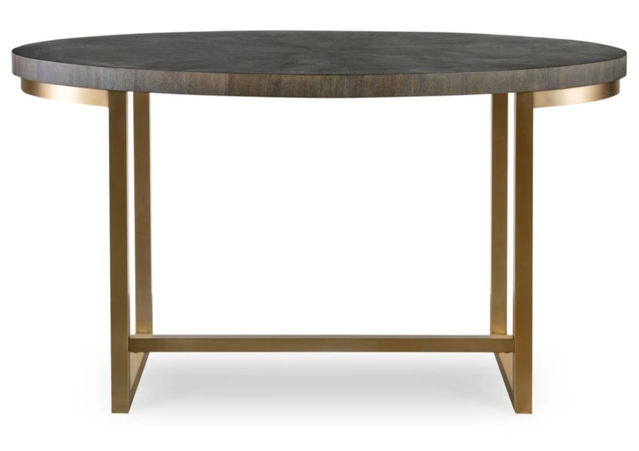 Contemporary in style, this oval writing desk features a bold stainless steel base plated in brushed brass with an acacia veneer top in a dark walnut stain washed with a light gray glaze. Read More