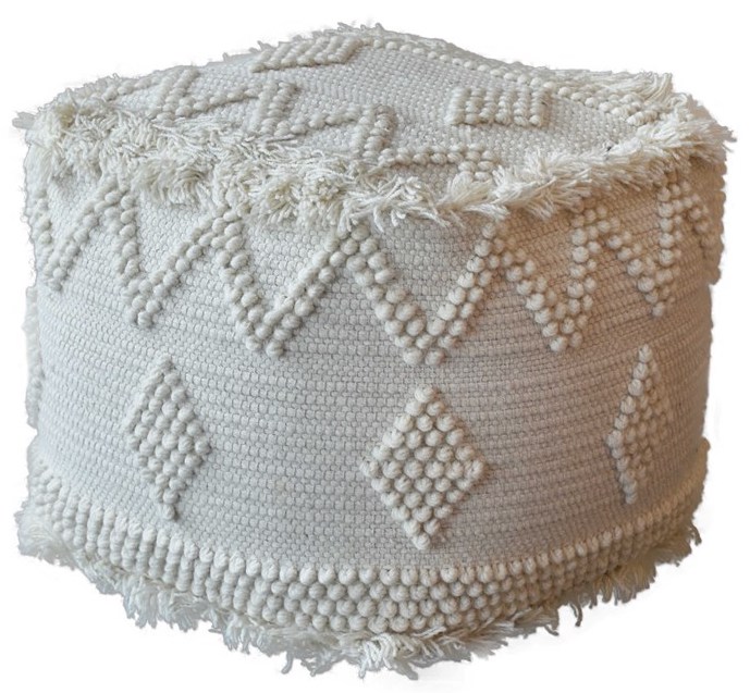Hand woven from a blend of wool and cotton in soft ivory, accented with raised bohemian inspired patterns and fringed edges.