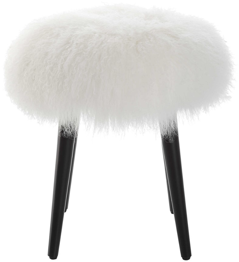 Elevate your room decor with Wooly accent stool. A true conversation piece, upholstered in unmatched luxury of authentic white New Zealand sheepskin on solid wood tapered legs in matte black. Read More