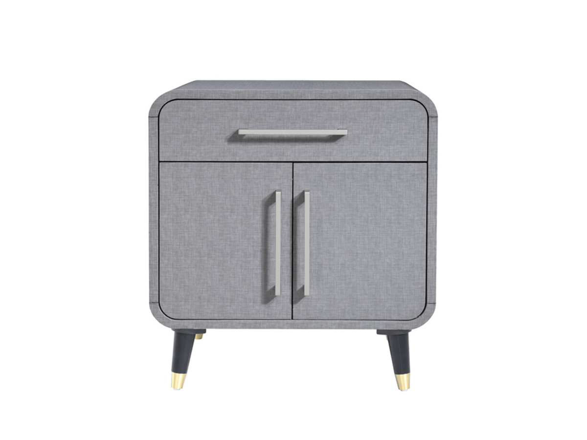 The Willow Nightstand combines contemporary charm with a touch of elegance, making it a versatile piece for any bedroom. Its rounded corners and soft gray-washed finish create a welcoming aesthetic, while the black legs feature gold detailing, adding a subtle sophistication. The nightstand includes a top drawer for essentials and two doors underneath for added storage, all accented with sleek silver hardware. Perfectly blending style and practicality, the Willow Nightstand is a beautiful addition that brings both convenience and elegance to your bedroom decor.
