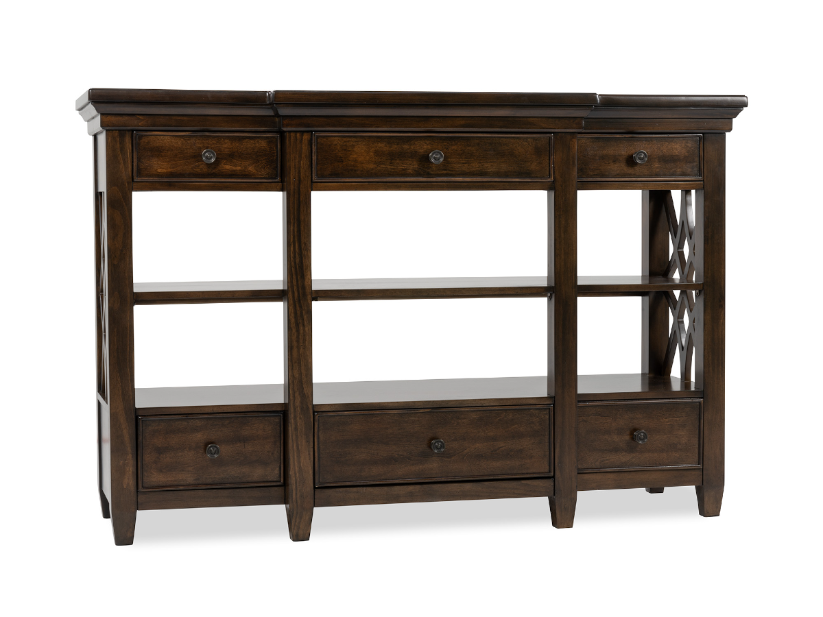 The Winston Server is a perfect blend of function and elegance for your dining space. Crafted from rich brown wood with a cherry finish and birch veneers, this server adds warmth and sophistication to any room. It features three felt-lined top drawers for delicate items, two open shelves below for display or easy access, and three additional bottom drawers for ample storage. Lattice-inspired side details complete the design, making this piece both practical and stylish for your home. Read More