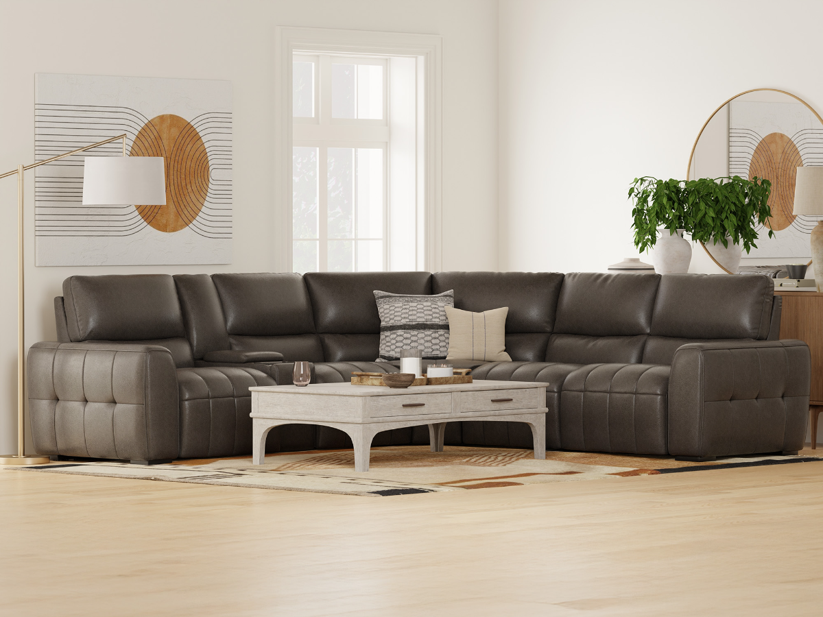 The York Sectional combines modern sophistication with premium functionality to elevate your living space. This six-piece sectional is upholstered in luxurious gray top-grain leather, offering timeless style and durability. Designed with power recline and adjustable power headrests, it ensures personalized comfort for every seat. The storage console adds practical convenience, featuring wireless charging, USB Type A and C ports, and hidden cupholders to keep your essentials organized and accessible. A unique tufted design on the outside arms and seats adds a touch of elegance, setting this sectional apart. Whether you’re entertaining or relaxing, the York Sectional provides the perfect blend of comfort, style, and innovation for your home. Read More